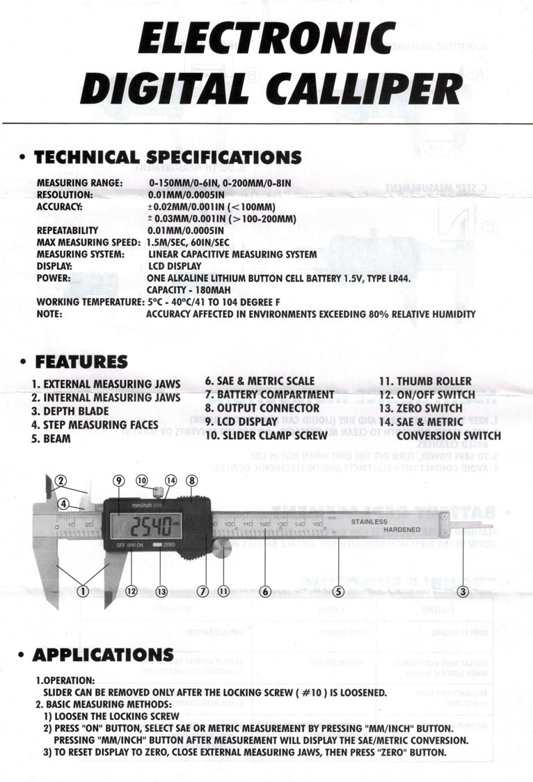 - 6" LED Electronic Caliper Measuring Jaws Range: 6" & 150mm