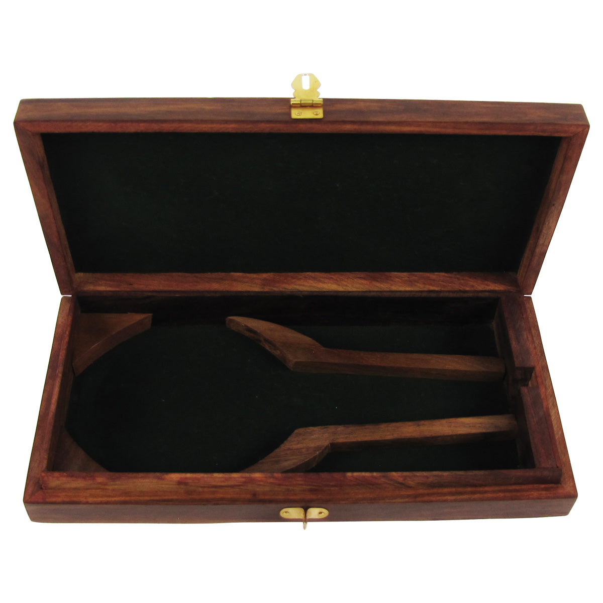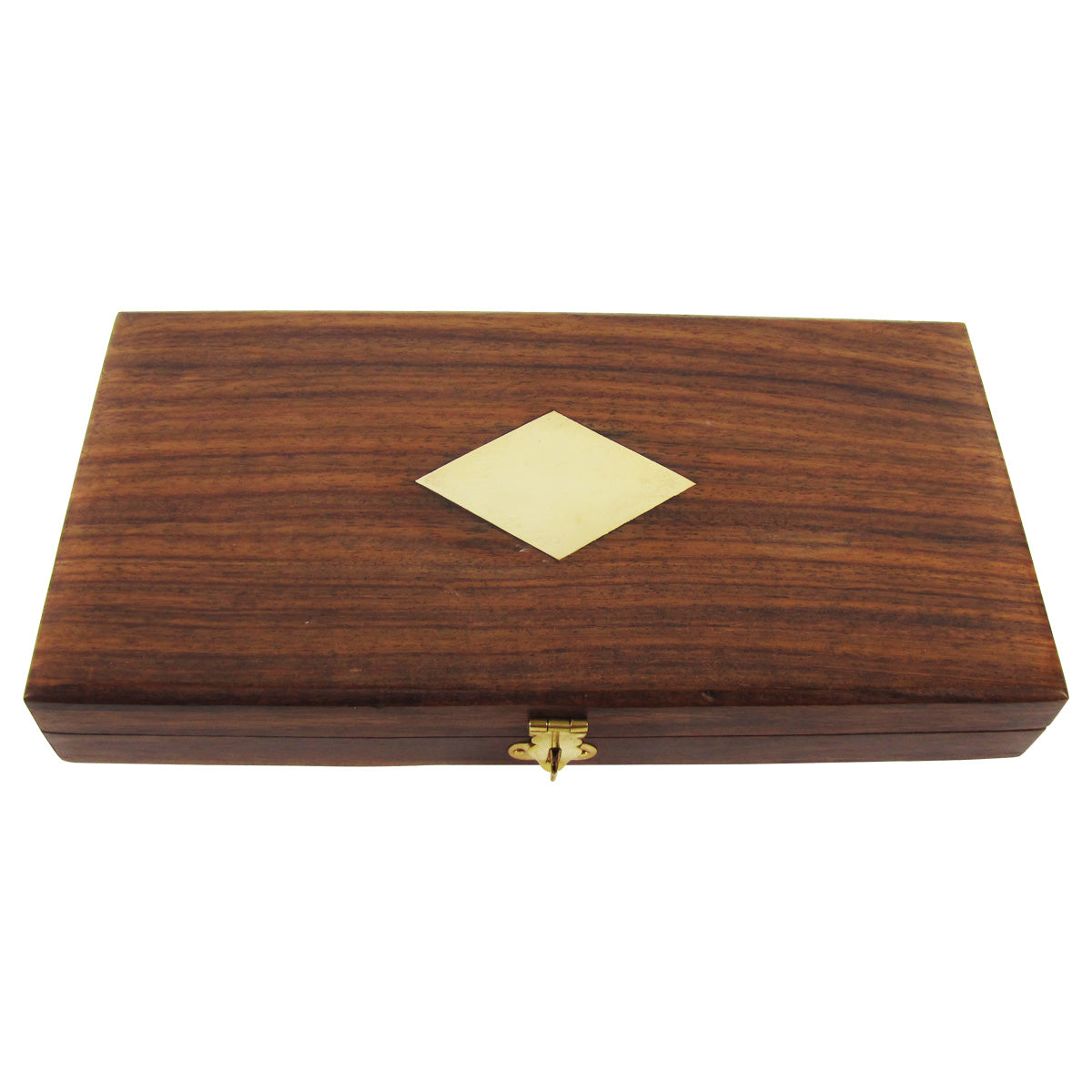 • Solid wood, felt-lined display box with brass diamond inlay and brass close clasp measures 10 3/8" long, 5 1/4" wide, and 1 1/2" tall