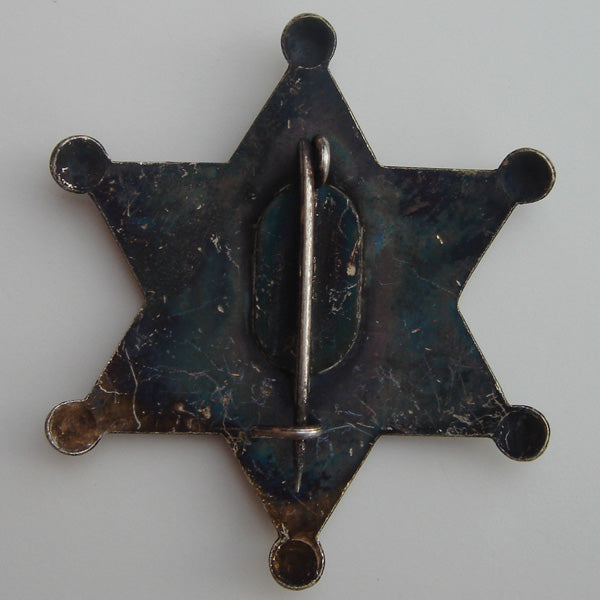 Own a piece of history with this vintage Old West obsolete 1900's sheriff badge. The undeniable classic six point sheriff star will add the perfect touch of western style to any costume or home movie set. Made from sturdy metal and made to look like an authentic antique, this 1900s law badge will make you feel like a real sheriff policing in the Old West. The antique police officer badge displays the word "Sheriff" with a design on the top and bottom of the stamped lettering, and has a thin pin on the back that runs vertically along the badge. The classic 6 point sheriff star badge measures 2 1/4" in diameter and weighs 2 oz. Like all of our badges, this item ships brand new in manufacturer's packaging with our 100% Customer Service Guarantee.