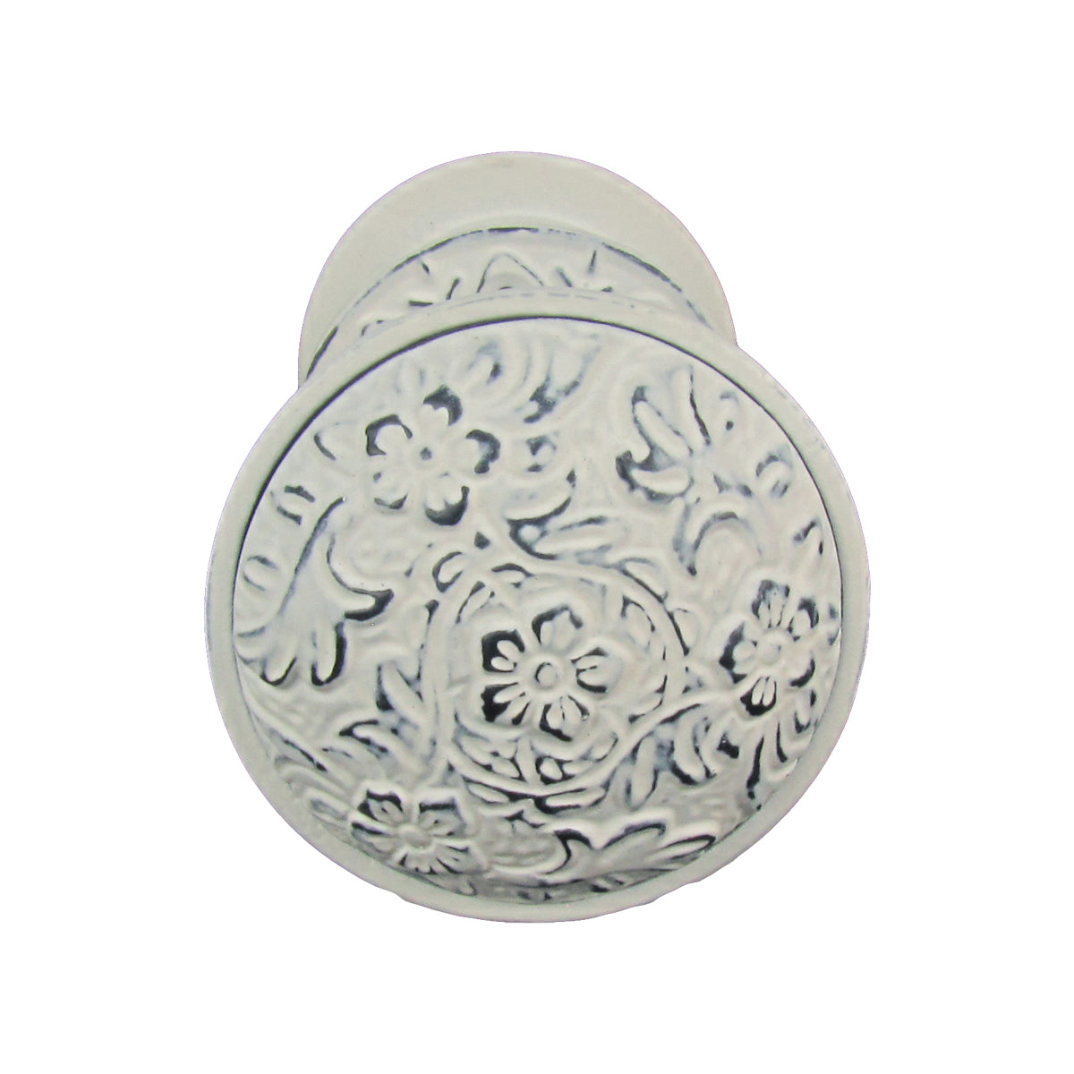 Bring vintage elegance into your home with this truly spectacular Antique Ornate Floral Door Knob Set. There is nothing more charming and tasteful than this antique reproduction set of 2 knobs with the shaft included. The Doorknobs feature a unique and remarkable embossed floral design all over the handle and the trim cover. The metal is brushed in a fine antique style white paint that can add to any decor. The Floral Doorknob measures 6 1/2" Long, 3 1/4" Wide, and 3 1/4" Deep when mounted to the door. Additionally, the shaft measures 1/4" in Thickness. The Antique Ornate Floral Door Knob Set ships brand new in manufacturer's packaging with our 100% Customer Satisfaction Guarantee.