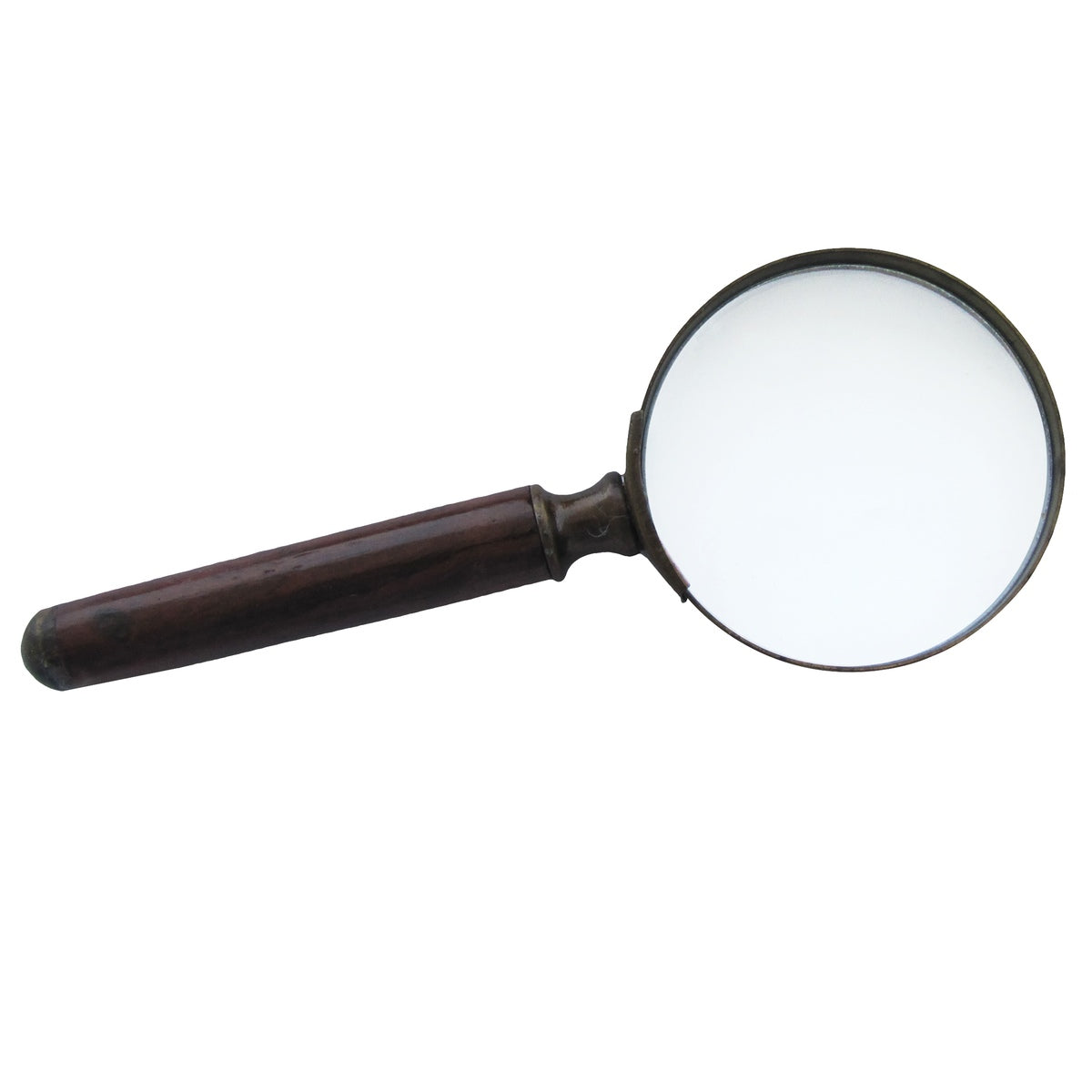 • The magnifying glass is an old world looking piece, featuring an antiqued finish on the solid brass ring, and an antiqued wood finish handle; measuring 5" in overall length, with a 2" glass.