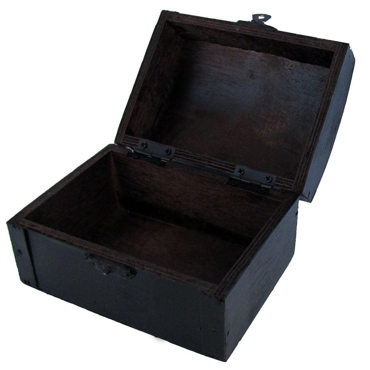 What a great piece of nautical decor to add to any room in your home, at your office, or on your boat, this antique reproduction wood treasure chest with the flag of Captain Calico Jack Rackham on the lid of the chest. From a child wanting to store their candy to an adult wanting to store a coin collection, this keep sake box will hold all valuables with a skeleton warning of beware, courtesy of Captain Jack himself. The treasure chest box is made from all wood, features a wooden hinged lid, with great metal appointments- from the hinges and clasp to the period accurate metal banding around the edges of the chest. Painted an antique black with a white Jolly Roger Skeleton skull and crossed swords (that of the flag of infamous Calico Jack) this box is sure to widen the eyes and inspire the imagination of children and adults alike. The box is ready to hold treasures found while metal detecting, beach combing, or other valuable keep sakes. The box itself measures 5" Long, 3 1/2" Wide, and 3" Tall. Captain Calico Jack Rackham Flag ships brand new in manufacturer's packaging with our 100% Customer Satisfaction Guarantee.