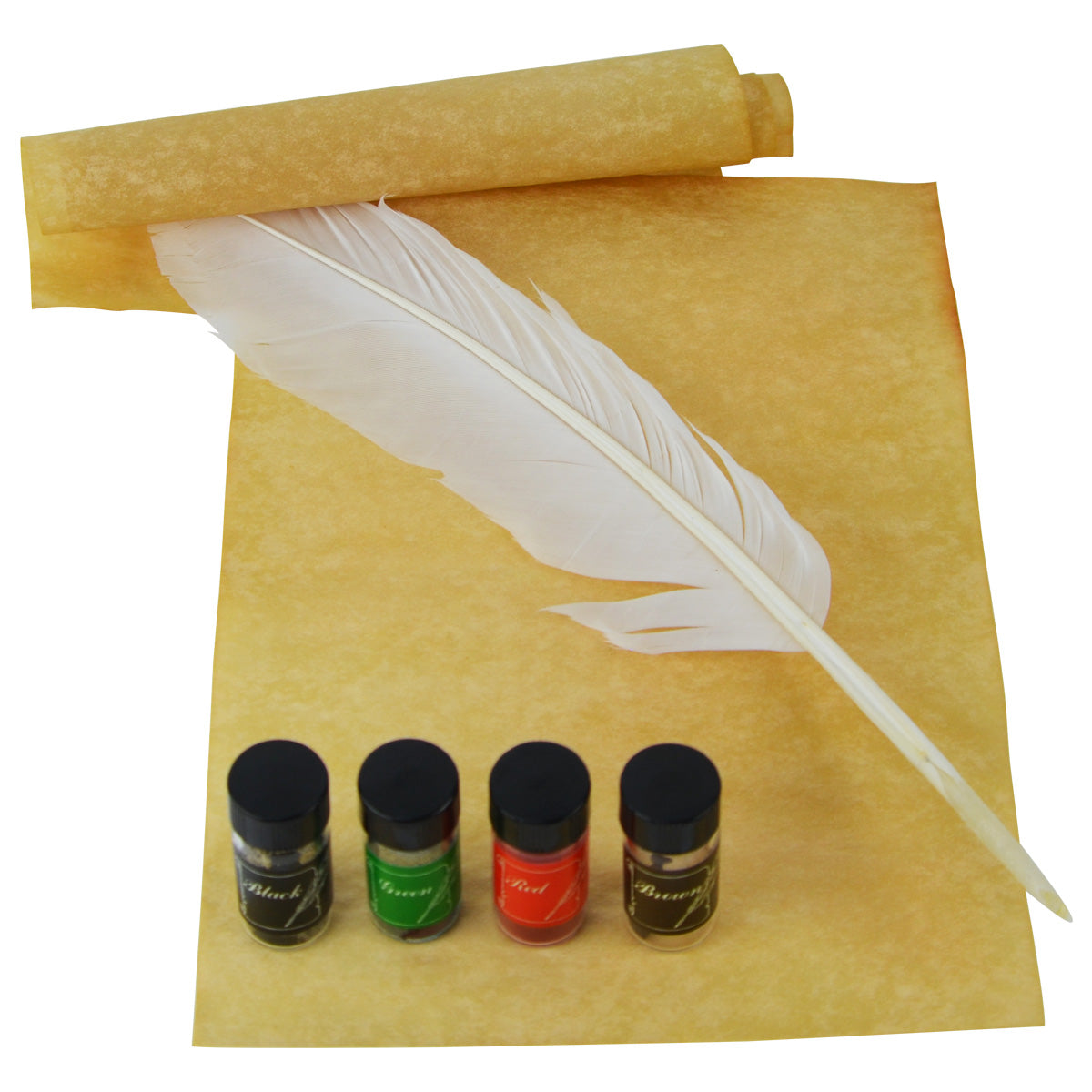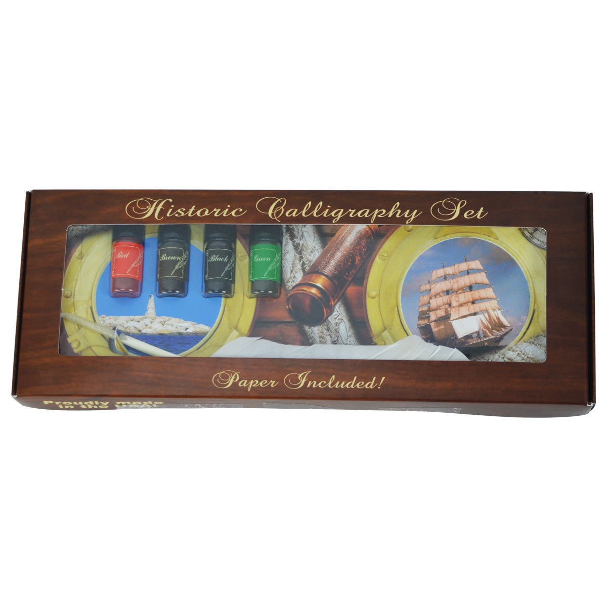 Feather Quill Pens are made from moulted flight feathers of a large bird and were used for writing with ink before the dip pen invention. This Antique Style Inkwell Refill Set will look great on your desk in your home, office, or library. Quill Pens were the primary writing instrument in the Western World from the 6th to the 19th Century, making this a perfect gift for authors, calligraphers, business professionals, crafters, historians, librarians, family, and friends. The Nautical Antique Style Writing Set Nib Pen measures 10” long, includes 2 sheets of 10” by 7” Parchment Paper, and 4 color ink bottles (brown, green, red, & black). Inkwell Refill Desk Set ships brand new in manufacturer's packaging and comes with our 100% Customer Satisfaction Guarantee.