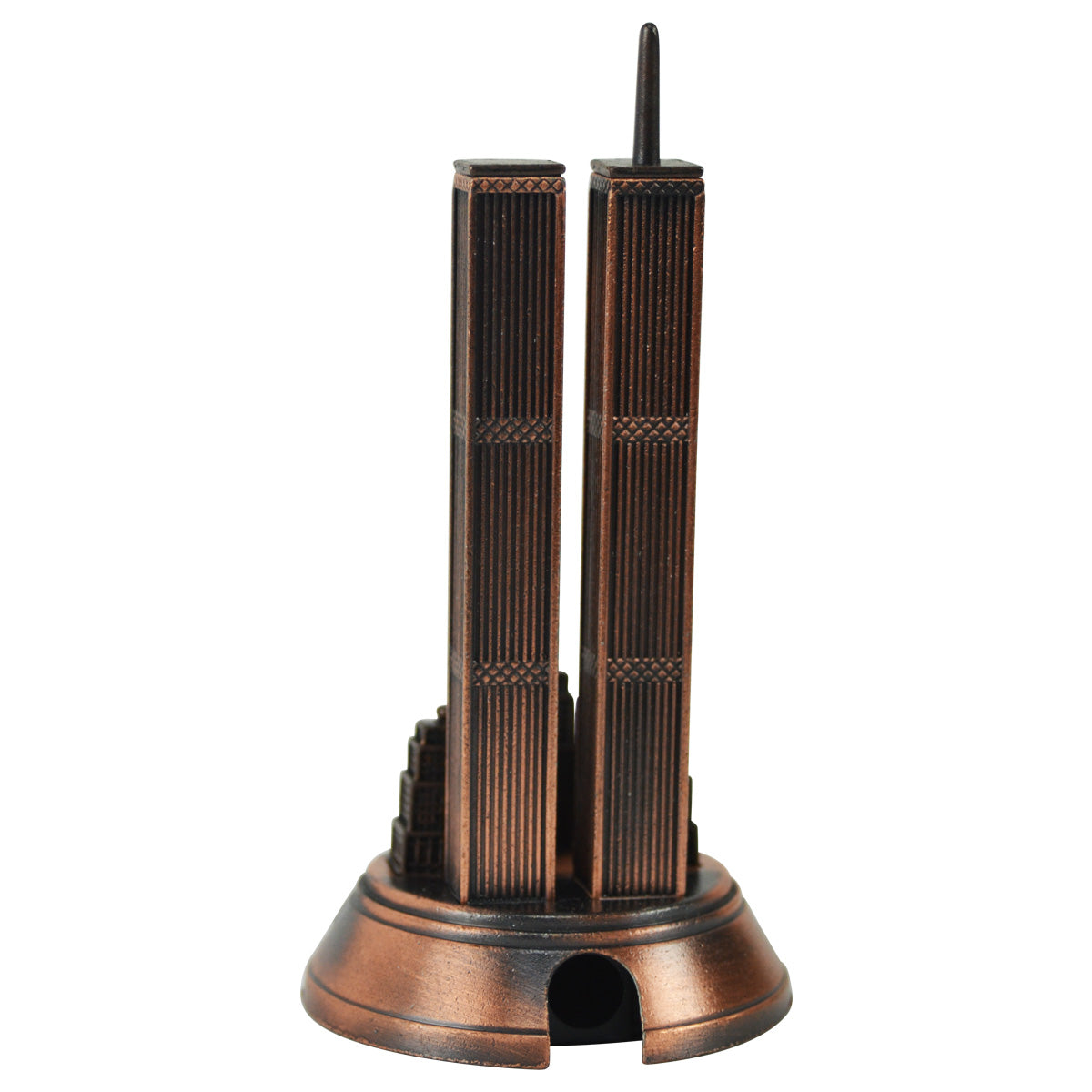 Iconic and historic, the World Trade Center reminds us of the tragic events of 9/11, and that we as a country will stand strong; that "We Will Never Forget". Embrace our Country and our Freedom, and add a historic landmark to your desk at home or at work with this Bronze Metal Model World Trade Center Replica. The intricately detailed Die Cast Miniature Replica features the North and South Towers sitting in the back of the World Trade Center Plaza, and the words "World Trade Center 1966-2001". This Miniature Die Cast WTC collectible also houses a hidden Pencil sharpener on the back, and is the perfect collectible showpiece for an office, in your home, to give as a gift to those who love or live in New York, or to add to your own pencil sharpener collection. This beautifully crafted Die Cast Miniature Replica World Trade Center Pencil Sharpener measures 2" long, 2" wide, and 4 1/4" tall, and ships brand new in manufacturer's packaging with our 100% Customer Satisfaction Guarantee.