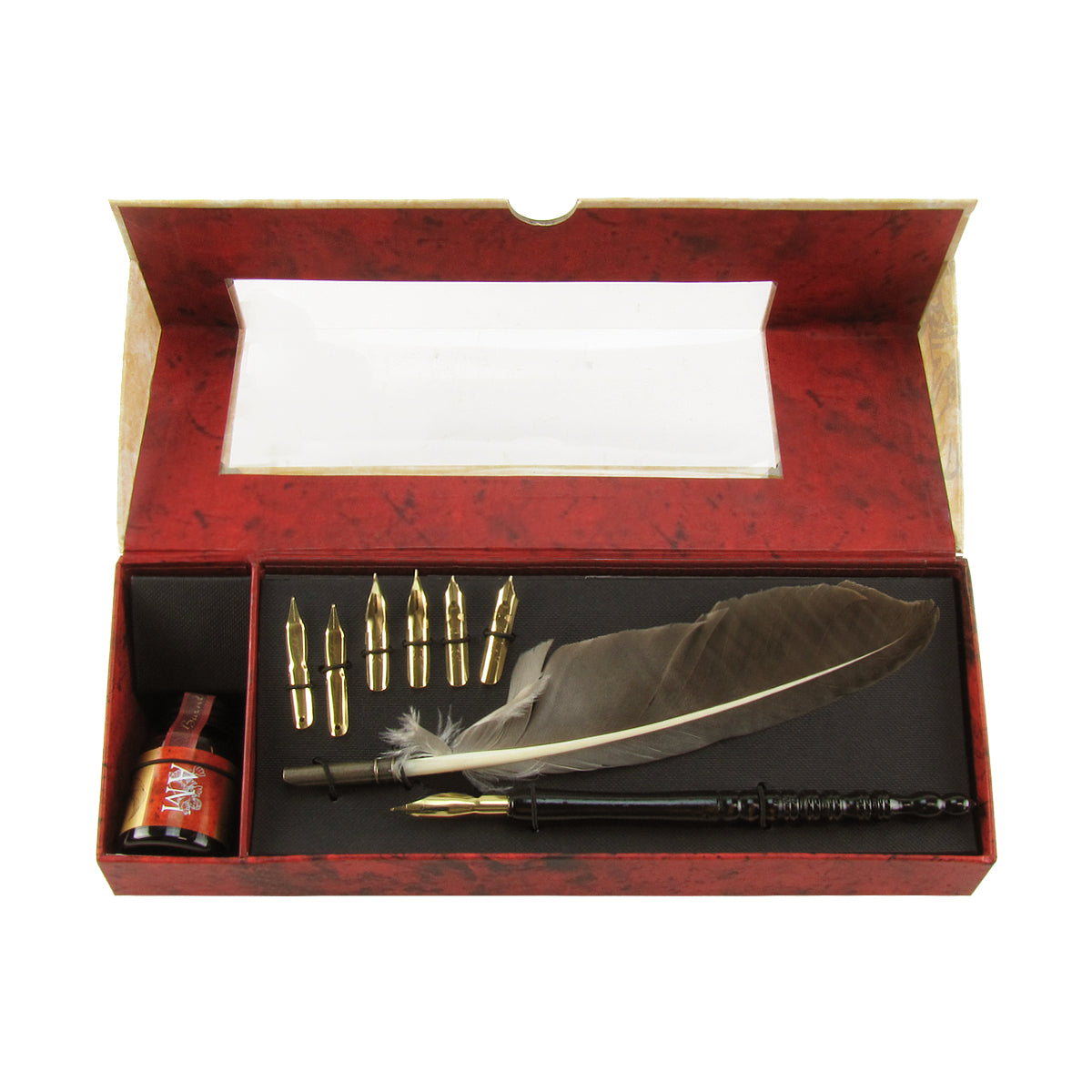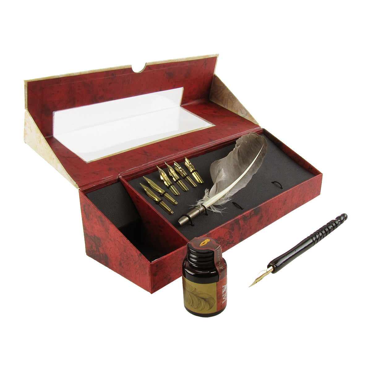 Travel Set with 7 Brass Nibs, 1 Feather Quill, 1 Wood Stylus Pen, and 1 Ink Bottle Features: