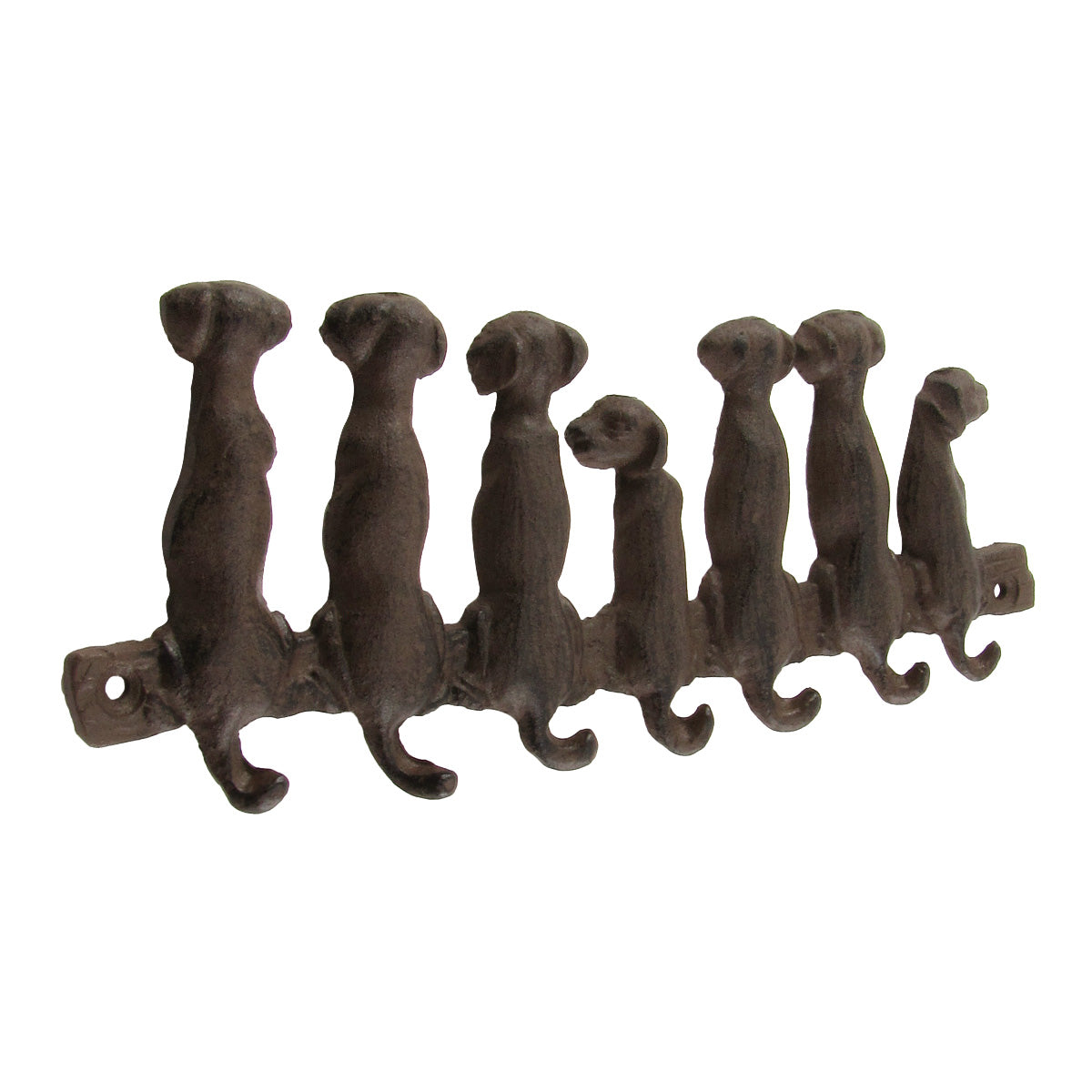 What's more adorable than this Dogs Tail Wall Mount Hook Rack? Great for yourself or as a gift, this cute hook features 7 total hooks that hang from the ends of the dogs' tails, making it a great place to store all sorts of items. Hang a dog or pet leash, a key ring, a coat, hat, or other winter clothes on this animal decor gift. This holder is made completely out of Cast Iron Metal, making it sturdy and durable for years to come. Dogs Tail Hook Rack features 2 pre-drilled holes on each side for easy mounting. Metal Wall Mount Dogs Tail Hooks measure 3 3/4" Long, 10" Wide and 1/2" Deep when mounted to the wall. Like all of our gifts, Clothes or Key Ring Holder ships brand new in manufacturer's packaging with our 100% Customer Satisfaction Guarantee.