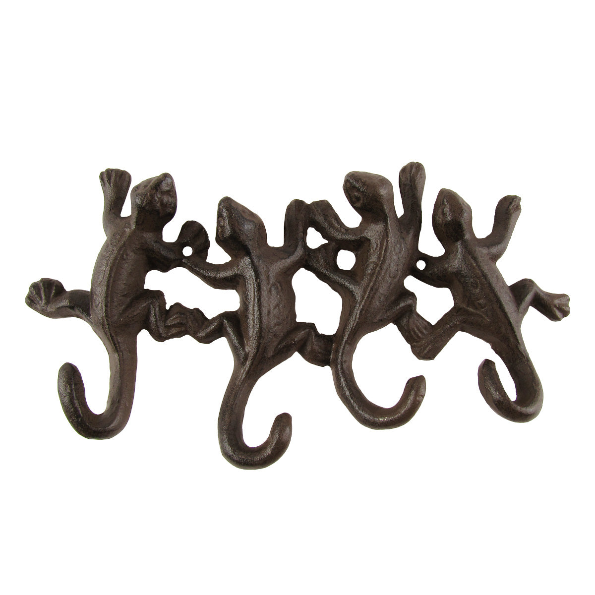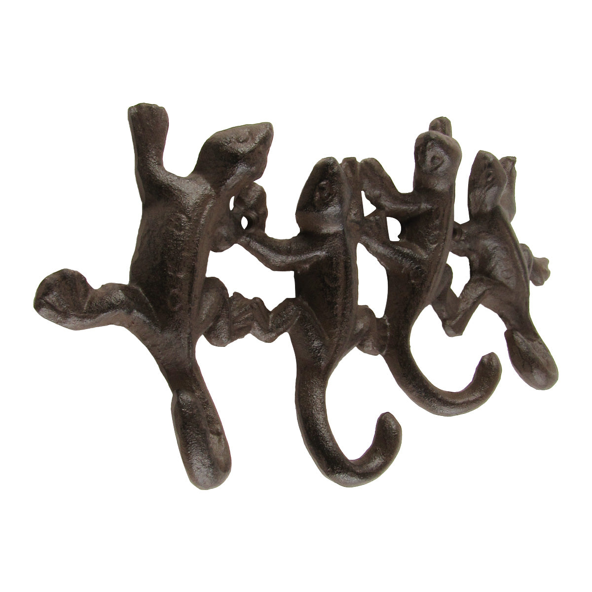 This Family of Geckos Wall Mount Hook would make a brilliant addition to your own wall or that of a friend or family member. This Gecko Holder features 4 hooks at the end of the tails and is very versatile. Hooks can be used as a hanger for a bathroom or kitchen towel, or a holder for your key ring, pet leash, or purse. This family of geckos is crafted out of Cast Iron Metal, and features 2 pre-drilled holes for easy mounting. The Wall Mount Gecko Hooks measure 4 1/2" Long, 9" Wide, and 1/2" Deep when mounted to the wall. Key Ring and Purse Hanger ships brand new in manufacturer's packaging with our 100% Customer Satisfaction Guarantee.