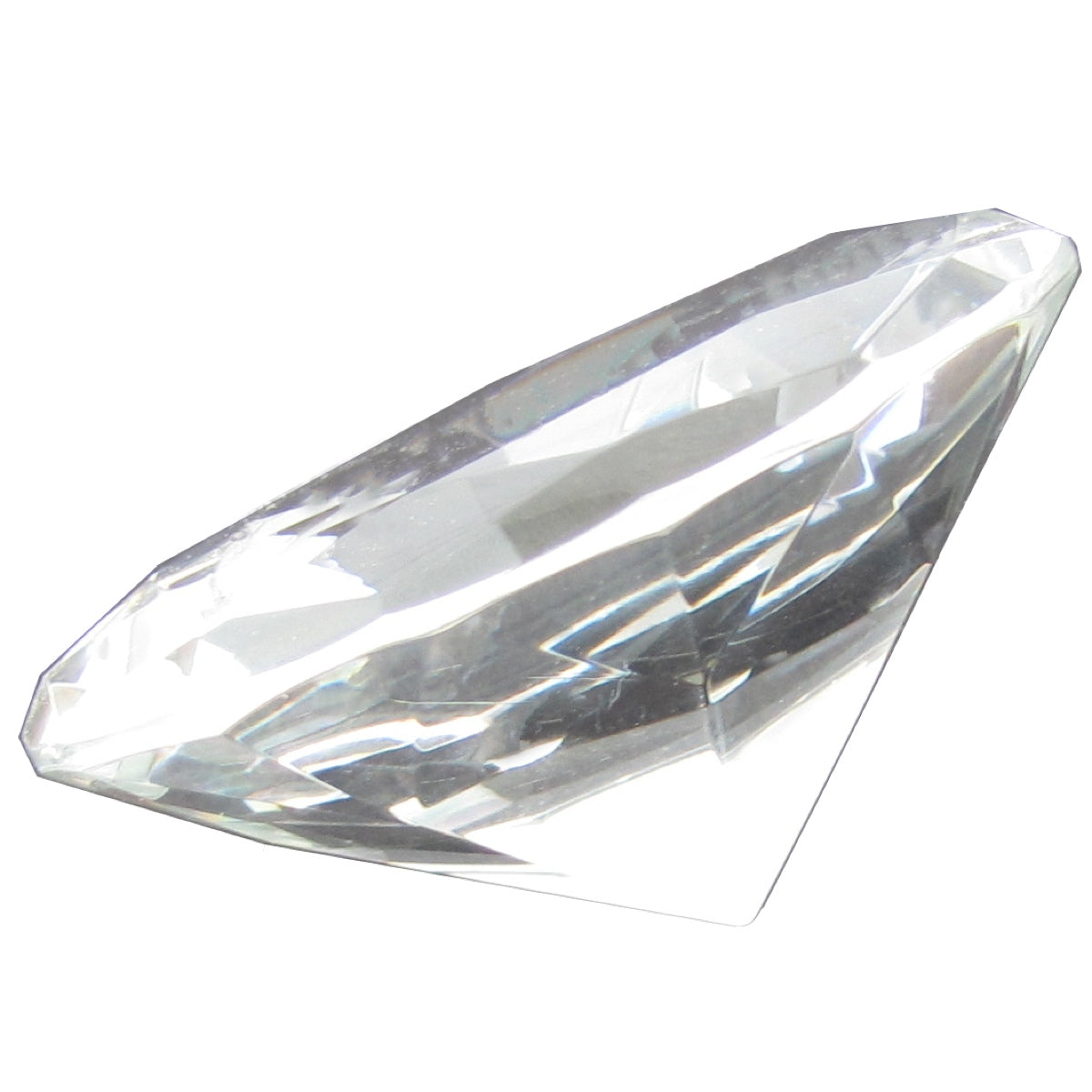 This giant 60 mm eye-catching cut glass clear gem is sure to make an impression. Measuring 2 1/4" in diameter by 1 1/4" Height, this big clear diamond Large Crystal Jewel would be perfect used as a decorative addition to place settings, a paperweight, a unique party favor, or as a token of immense affection for that person who'd love to get a "giant rock." The sparkling facets of this 60mm cut glass gem catch the light and sparkle, making it a beautiful addition to your table, desk, shelves, or windowsill. The 60mm Diamond Jewel ships brand new in manufacturer's packaging with our 100% Customer Satisfaction Guarantee.