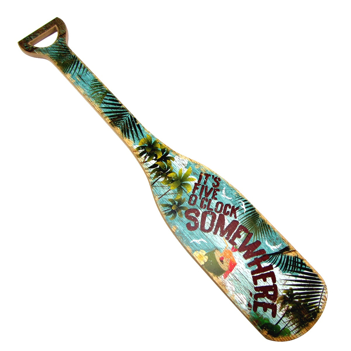 - Wood Oar Sign reads "Its 5 OClock Somewhere", is painted with a tropical flair, measuring 33 ¾” long by 6” wide, 1/2 “ thick, and weighing just under 3lbs