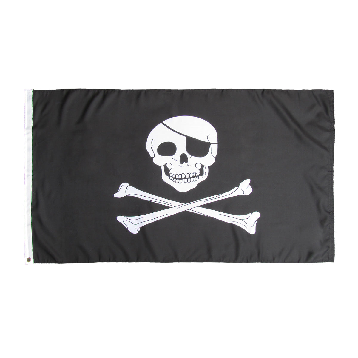 • On the flag, there is pictured the traditional Jolly Roger imagery with the white skull wearing an eye patch on a black background