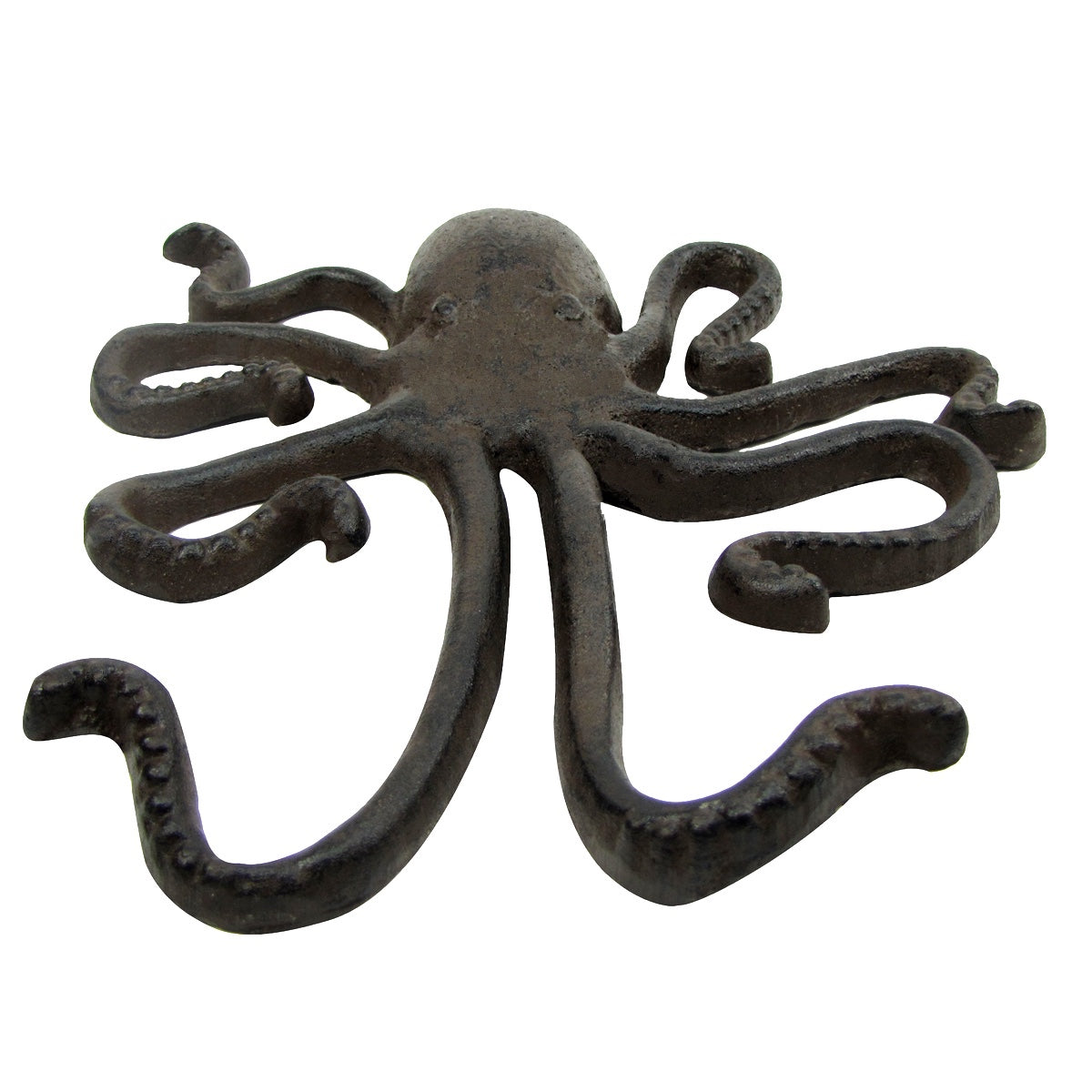 Add some coastal decor to your kitchen, bathroom, patio, or home with this Large Metal Wall Mount Octopus Plaque Wall Towel/Key Hook. The Octopus has an amazing ability to hide in plain sight by quickly changing colors, though this one will stay its rustic brown color for years with it's protective clear coat finish. Heavy Cast Iron Octopus Plaque has great detailing, and features a hanger on the back to mount easily to your wall. Great for indoor or outdoor use, this octopus hook will happily hold a beach towel, bathrobes, hats, coats, or your key. The cast iron metal Octopus measures a large 11" long by 11" wide with 2 arms as hooks, 1 ¼” thick. This large Octopus weighs 6lbs, sure to hold up for years of service. Metal Wall Moutn Octopus 2 Hooks makes a great gift for family and friends, ships brand new in manufacturer’s packaging, and comes with our 100% customer satisfaction guarantee!