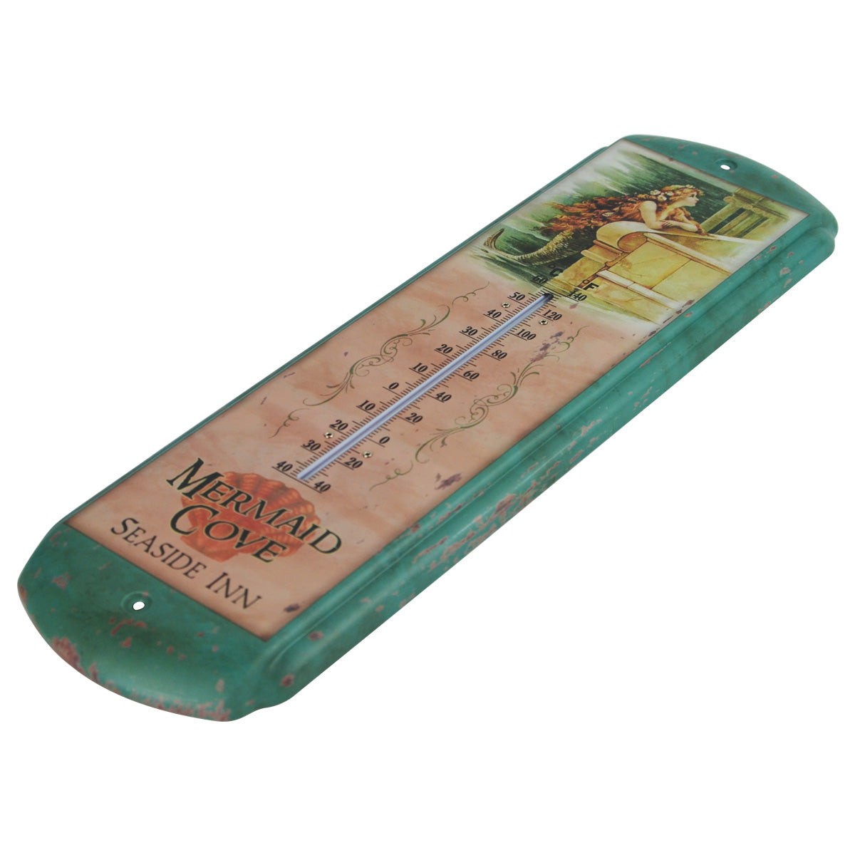 - Thermometer is brand new, with a rustic painted finish to look like a vintage reproduction, and reads "Mermaid Cove Seaside Inn"