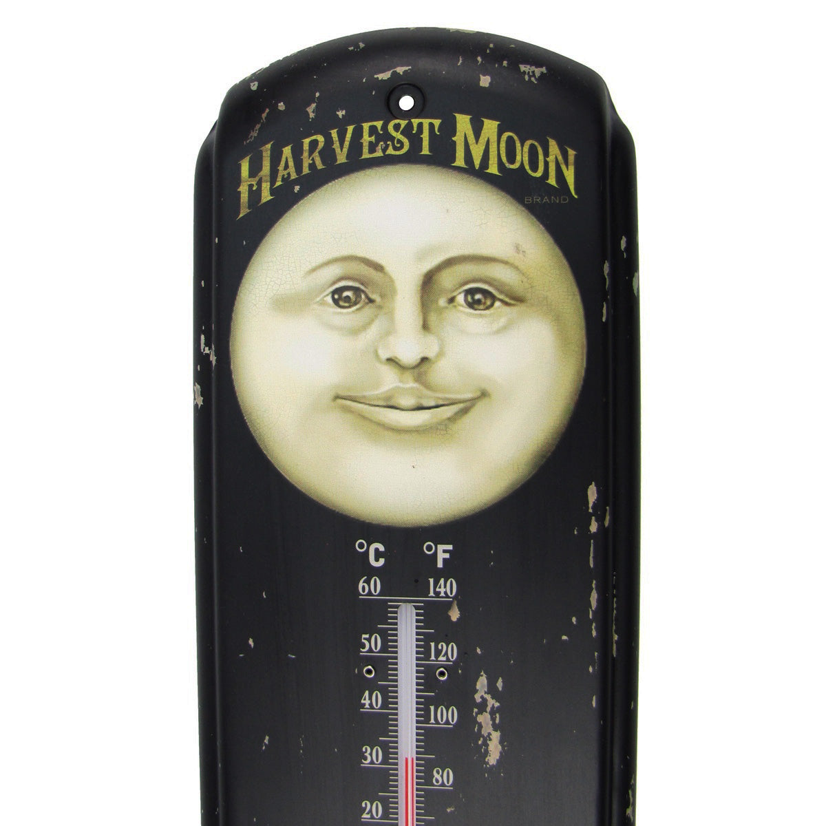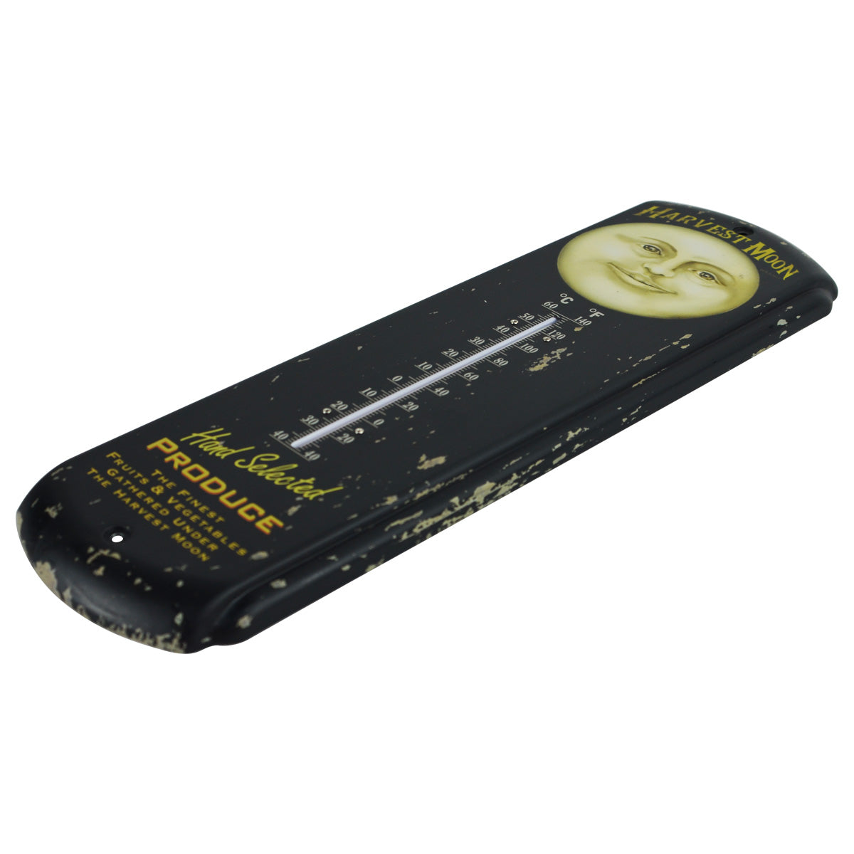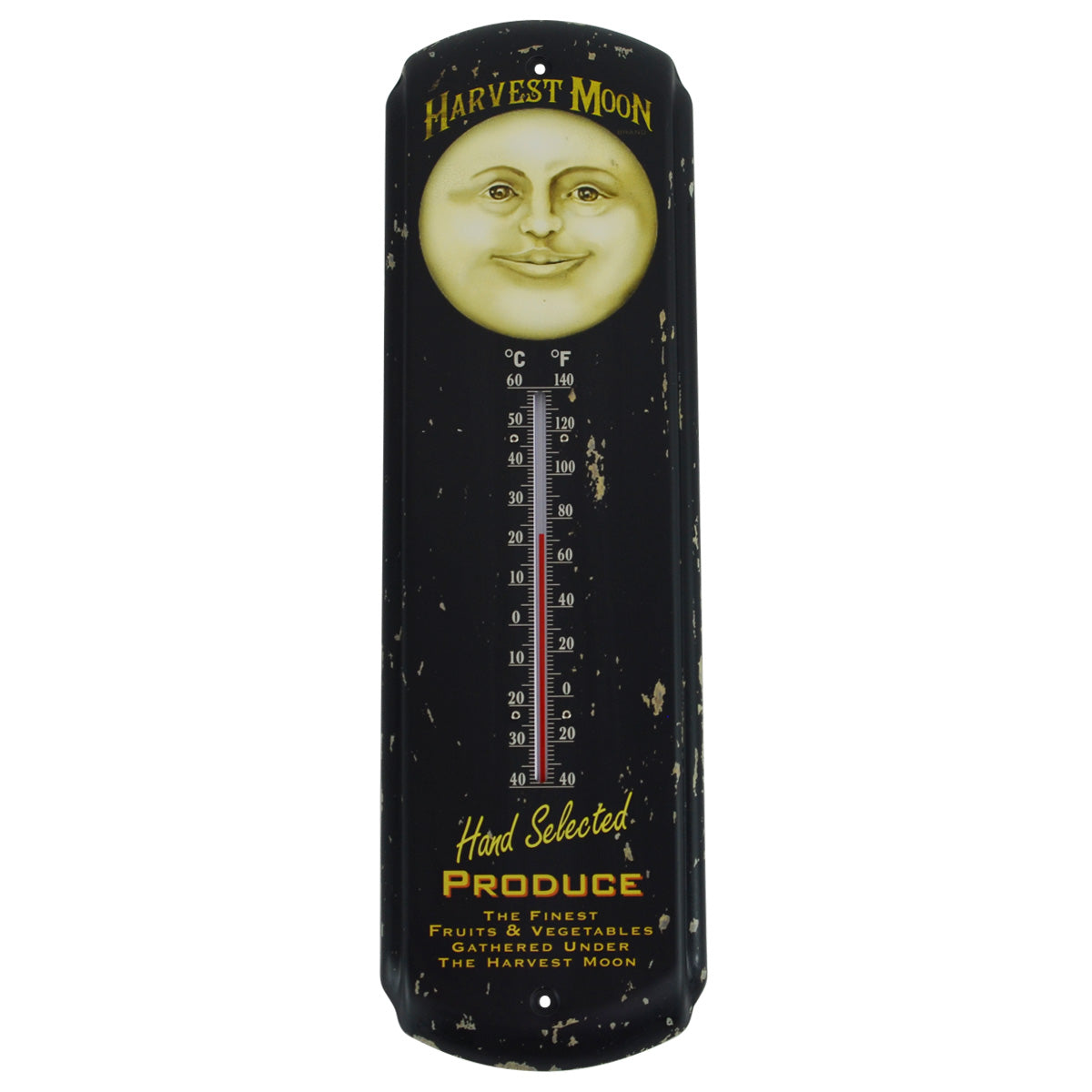 • Thermometer is brand new, with a rustic painted finish to look like a vintage reproduction, and reads "Harvest Moon Hand Selected Produce -The Finest Fruits&Vegetables Gathered Under the Harvest Moon"