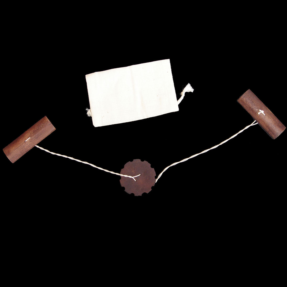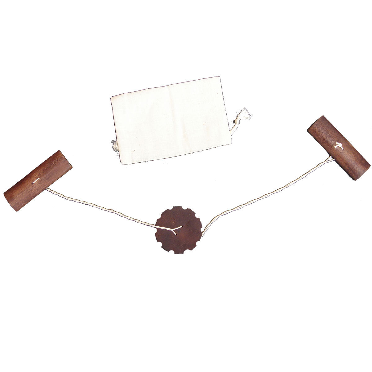 Recreate the simple pleasures of primitive folk life with this hardwood antique reproduction buzz saw toy. A favorite toy of colonial children, this 3" historical wood buzz saw is a fully functional wooden noisemaker! Originating from the Native American culture, the buzz saw was originally made from a piece of bone and string, and in colonial times was made from one of Mother's buttons (hence the name, Button on a String, by which the buzz saw is also known). This buzz saw game is made from hardwood, with two wooden handles. Simply wind up the string and gently pull the wood handles to spin the wooden blade on the buzz saw and create its sound. The handheld blade of the buzz saw measures 3"in diameter, 20" long, and comes with a cloth carry bag. The primitive buzz saw game is ships brand new in manufaturer's packaging with our 100% Customer Satisfaction Guarantee.