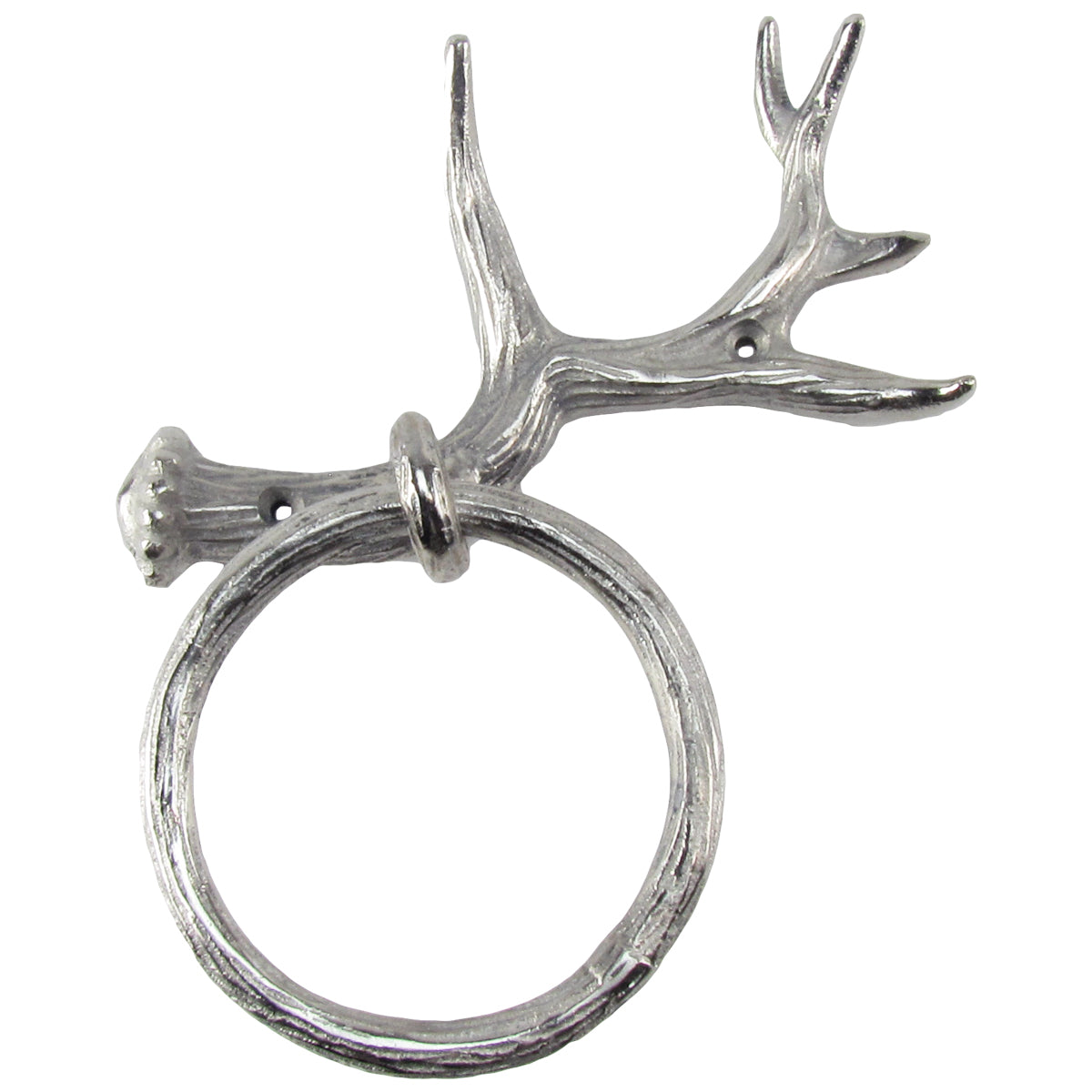 - The Metal Deer Antler Towel Holder features a finely crafted buck antler with a weathered-looking silver finish