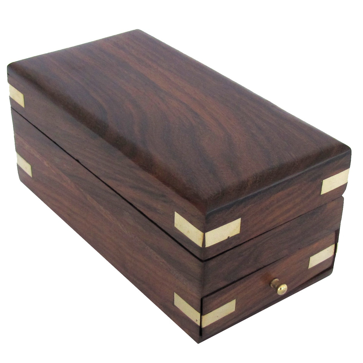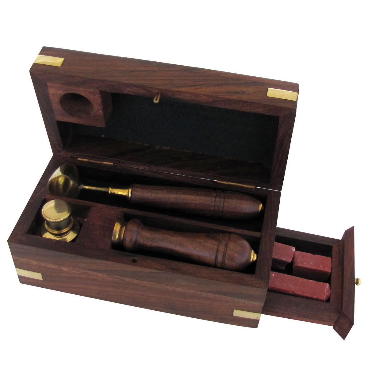 • Wood Box stores everything in your wax seal set, measuring 6" wide, 3" deep and 2 1/2" tall with beautiful brass accents and antique wood finish