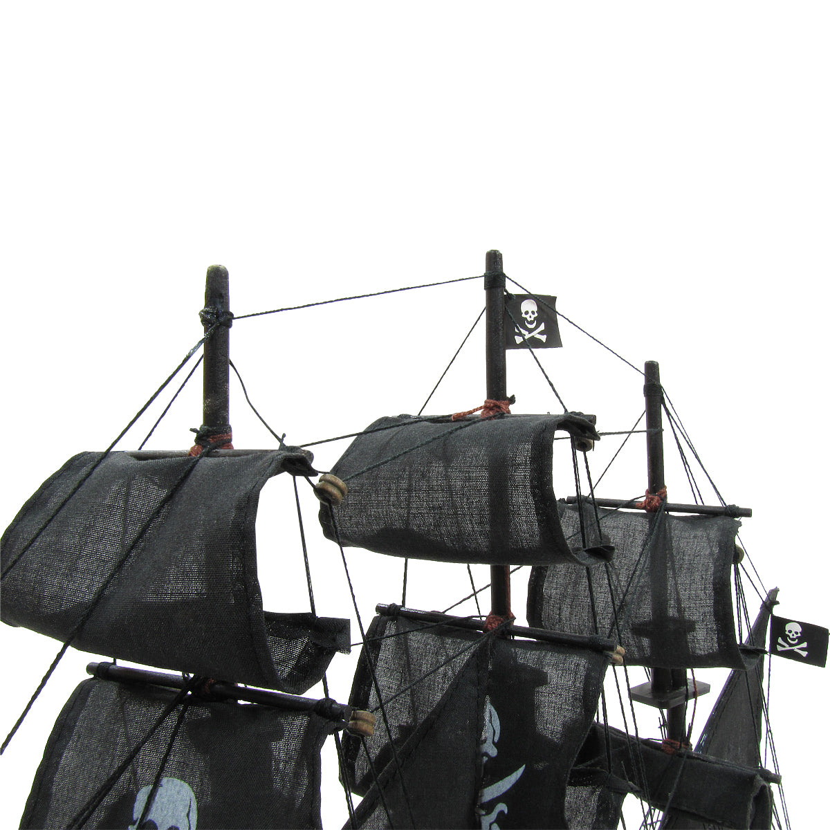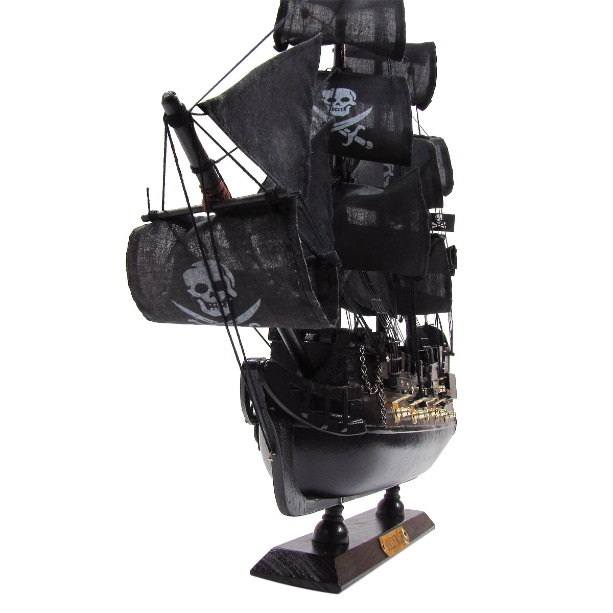 Take control of the High Seas without ever leaving land with this Wood Pirate Ship Model and Display Stand. This ship is a fully buildable model of a classic Calico Jack Rackham vessel painted completely in black. The color black was especially helpful for pirates who did most of their swashbuckling business under the cover of nightfall. The only identifying mark on this model ship is that of the Jolly Roger Flag emblazoned in white upon a black banner sail. The Ship Model features 6 small brass cannons on each side, an attached anchor, and three masts on the ship. The Model Ship measures 15" Long, 15" Tall, and 4" Wide. The Pirate Model and Display Stand ship brand new in manufacturer's packaging with our 100% Customer Satisfaction Guarantee.
